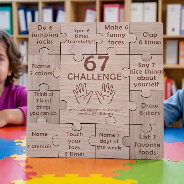 The 67 Challenge Puzzle is a fun, screen-free way for kids to move, think, and build confidence through play. Each wooden puzzle piece features one simple challenge—combining movement activities and positive thinking prompts—that kids complete as they assemble the puzzle. When finished, they’ve completed the 67 Challenge! Why You’ll Love It Encourages movement and mindfulness Builds confidence and positive self-talk Screen-free, hands-on play Smooth, kid-friendly wooden design What’s Included 12” laser-engraved wooden puzzle Center piece: 67 Challenge 12 unique challenge pieces (no duplicates) Perfect For Ages 6–8 • Family play • Classrooms • Thoughtful gifting