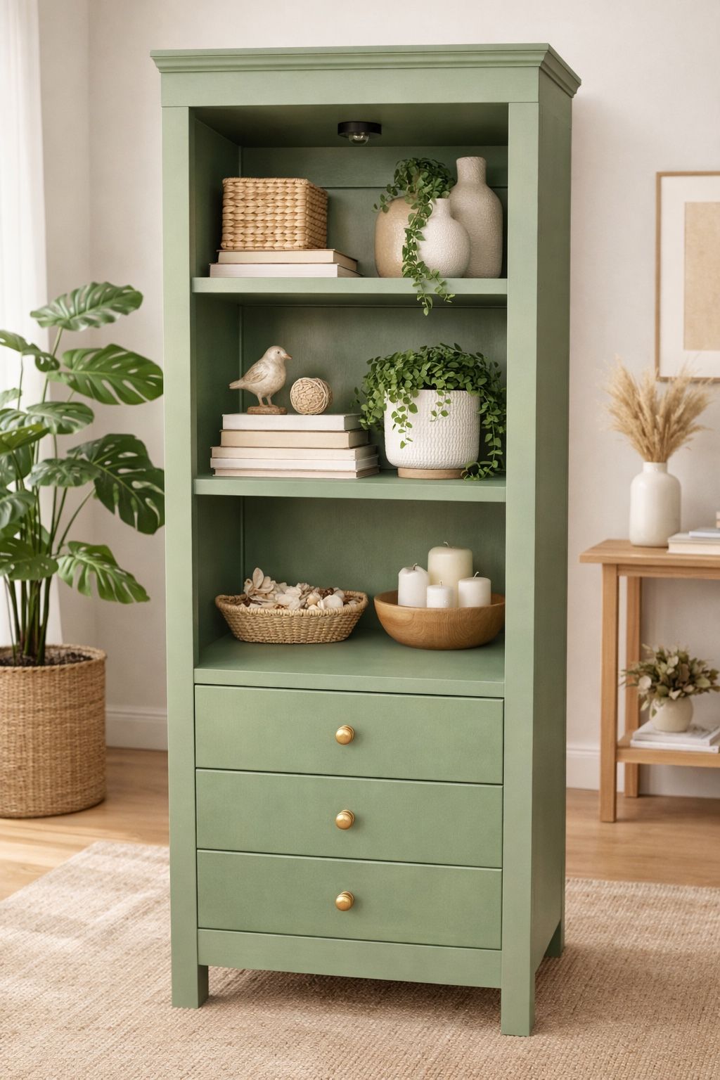 Sage Green Bookshelf with Drawers – Solid Wood