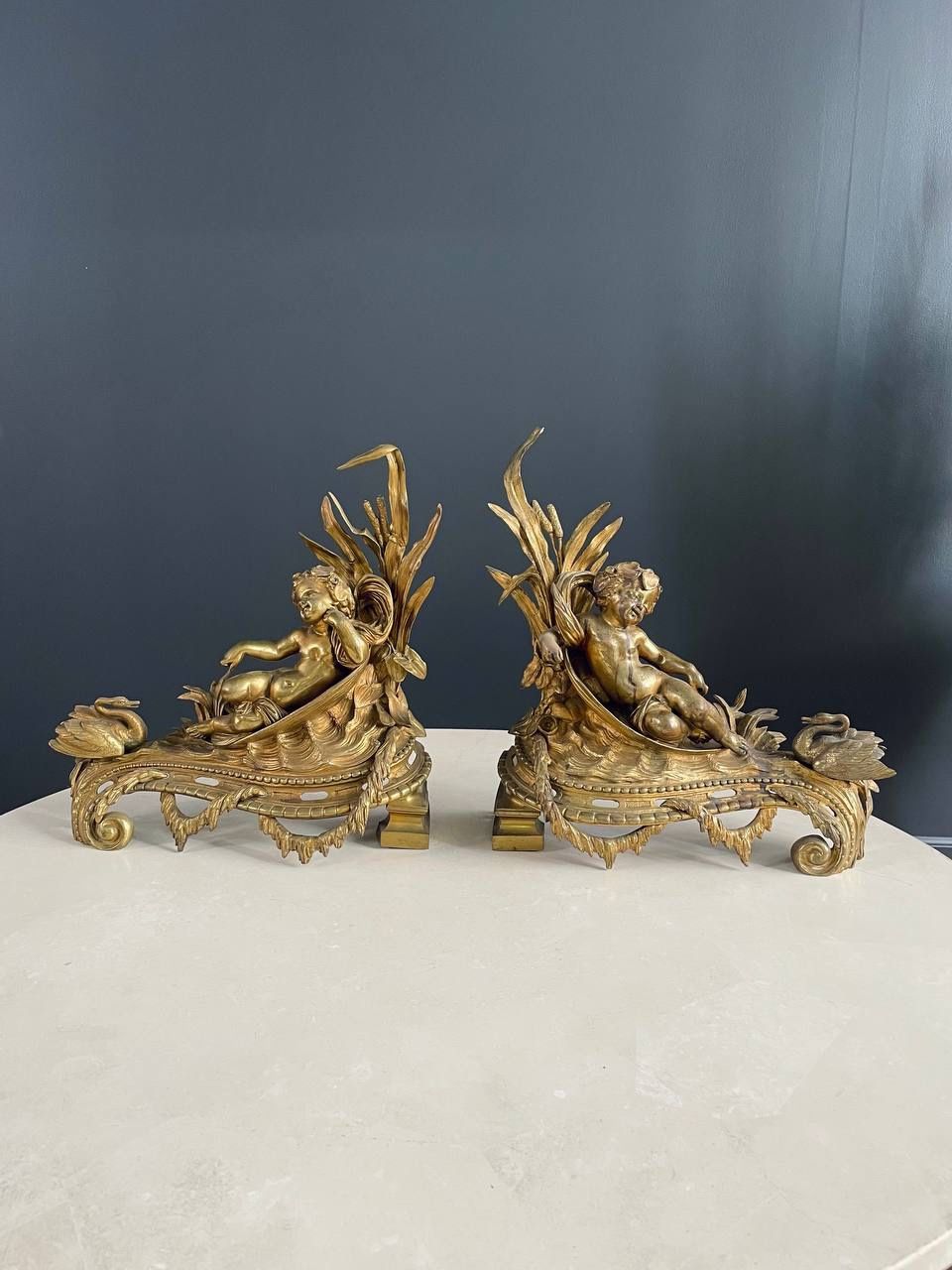 Pair of French Antique Cast Brass Belle Epoque Style Andirons, c.1,920’s - Delivery Available