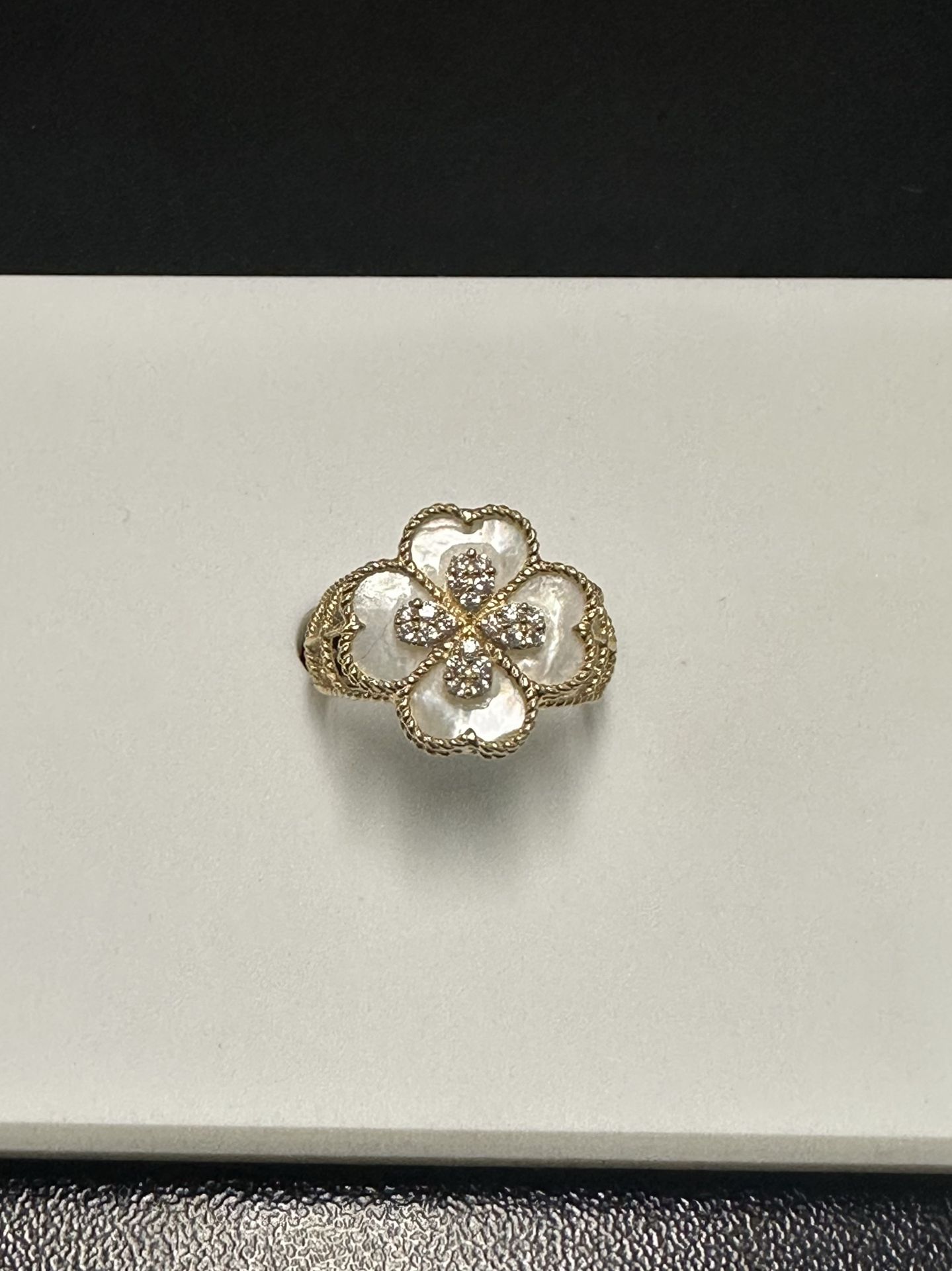 18k mother of pearl clover with small center diamonds 2.4 grams Size 4 1/4- can be resized for an additional price Final clearance price +tax 3 month layaway available!