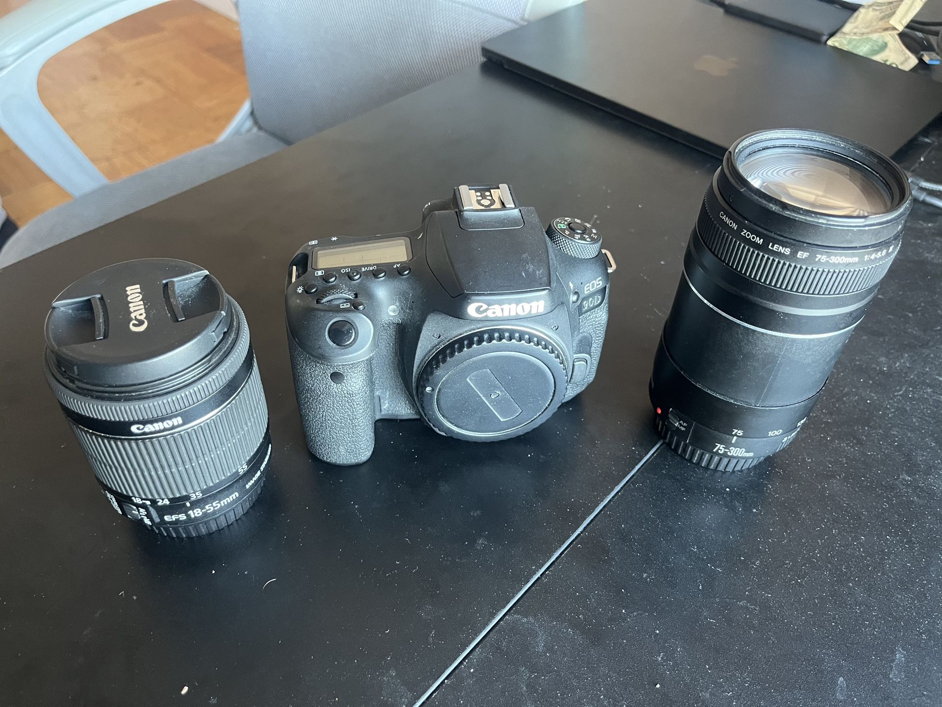 Great condition Canon 90D DSLR camera, comes with an 18-55mm lens, a 75-300mm telephoto lens, and 1 battery.