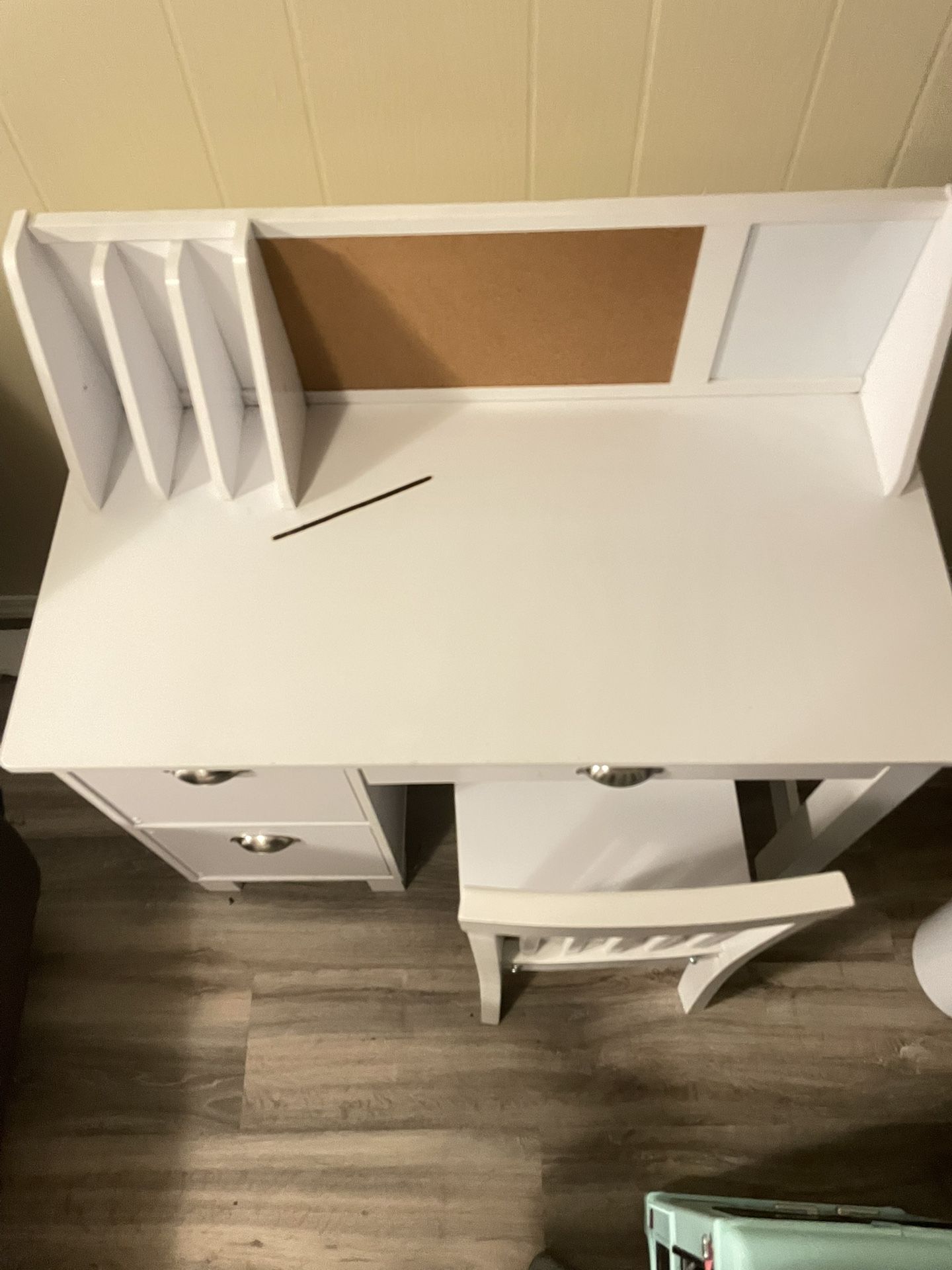White Desk and Chair, smaller size, would fit kid room well.