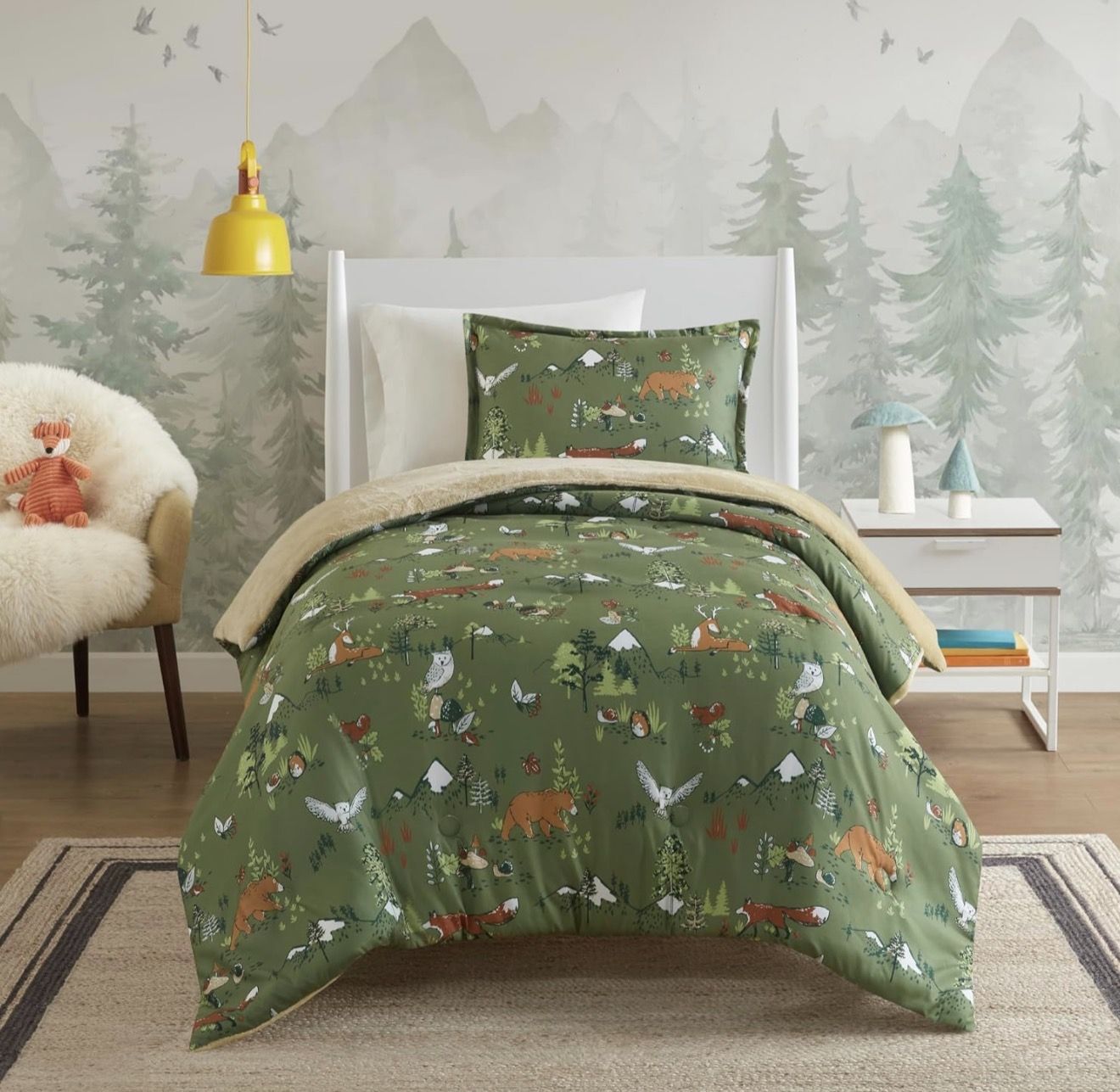 New in Package. Retail at $60. Please see manufacturer's descriptions below. Comforter/Sham: Front 100% Polyester Microfiber; Reverse Polyester Plush. Adorable Design - Let your loved ones indulge in a whimsical fantasy as they snuggle with their favorite forest animals in this charming kids' bedding set featuring cute and adventurous theme. Comfortably Soft - With a soft brushed microfiber top, plush microfiber reverse, and skin-friendly polyester fill, this bedding becomes the perfect sleeping companion to gently lull your children into the sweetest dreams. OEKO-TEX Certified - Experience superior comfort and wellness with our bedding set. Certified free from any substances or chemicals that compromise quality, the set is also hygienically treated for longer-lasting freshness Package Includes: Twin 66"W x 86"L, 1 Sham: 20"W x 26"L. Easy Care - Machine washable. Use large capacity washer and dryer for best results. Cold/delicate cycle, low/no heat dry. Comes in compressed d & smaller packaging reducing carbon footprint. To remove.