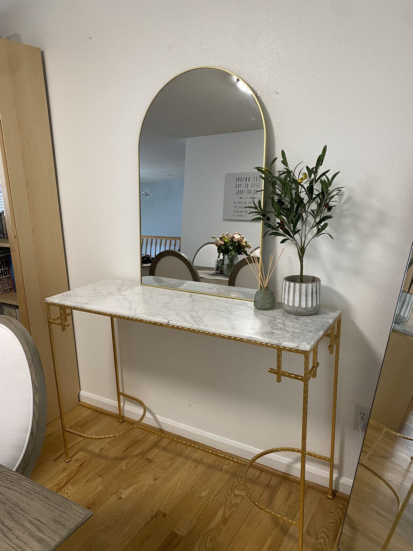 Marble consol /sideboard / vanity Salisbury & Manus Worlds Away Match Hammered Gold Leaf Consol With Marble Top Marble Consol WORLDS AWAY MARCY GOLD WHITE Originally $1,430.00 before tax Asking$500 obo Matching ottoman available Hammered Gold leaf console with white marble top. COLOR: Gold. White DIMENSIONS: 48"W X 33"H X 16'D Pick up in auburn 98001 Crate and barrel pottery barn CB2 Restoration Hardware target MCM boho vintage like heavy duty