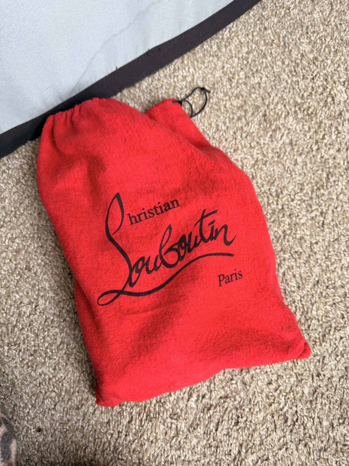Used Christian Louboutin black patent leather pumps (classic red sole). Condition: Used — my dog chewed the front sole area (see photos). Damage is cosmetic and fixable by a cobbler (sole repair). Heels and uppers are still in good shape. ✔ Authentic ✔ Includes original Louboutin dust bag ✔ Size 36.5 (US ~6.5) ✔ Great deal for someone who knows shoe repair or wants designer shoes cheap Price: $10 Cash only please