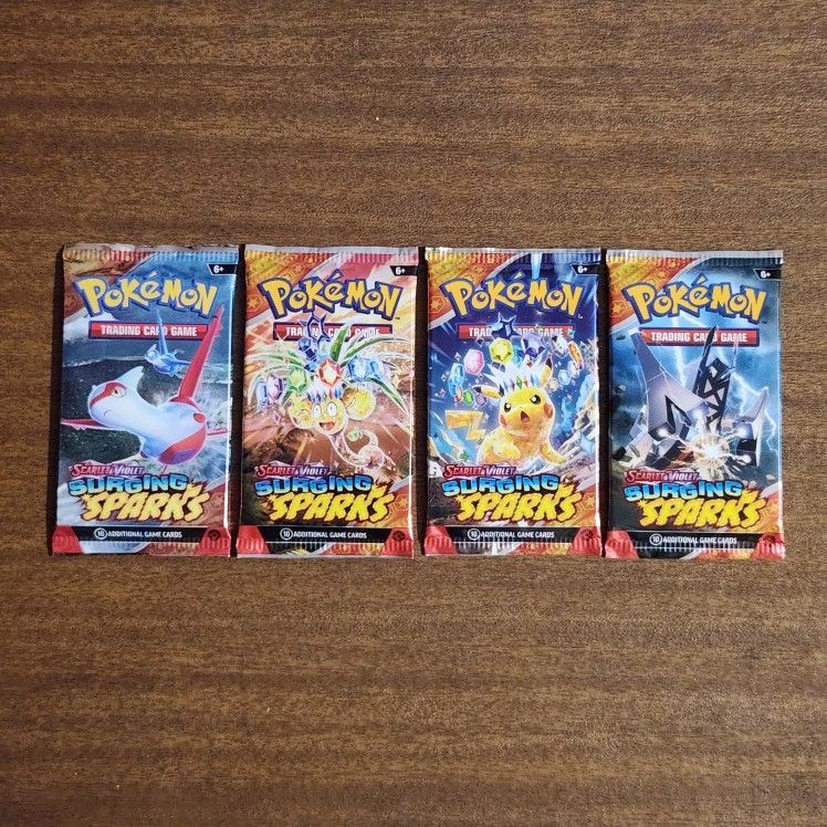 Brand new Scarlet and Violet Surging Sparks Booster Pack Art Bundle [Set of 4] selling all four packs for $28. I have proof of purchase for all packs. FYI: Current secondary market prices as of March 21, 2026 COLLECTOR APP : $27.16 TCG PLAYER : $20.99 + $9.99(shipping) NO DELIVERY. PICK UP ONLY. PRICE IS FIRM WILL NOT GO LOWER. CHECK OUT MY PAGE FOR OTHER LISTINGS. NO TRADES. CASH OR ZELLE ONLY. HABLO ESPAÑOL.