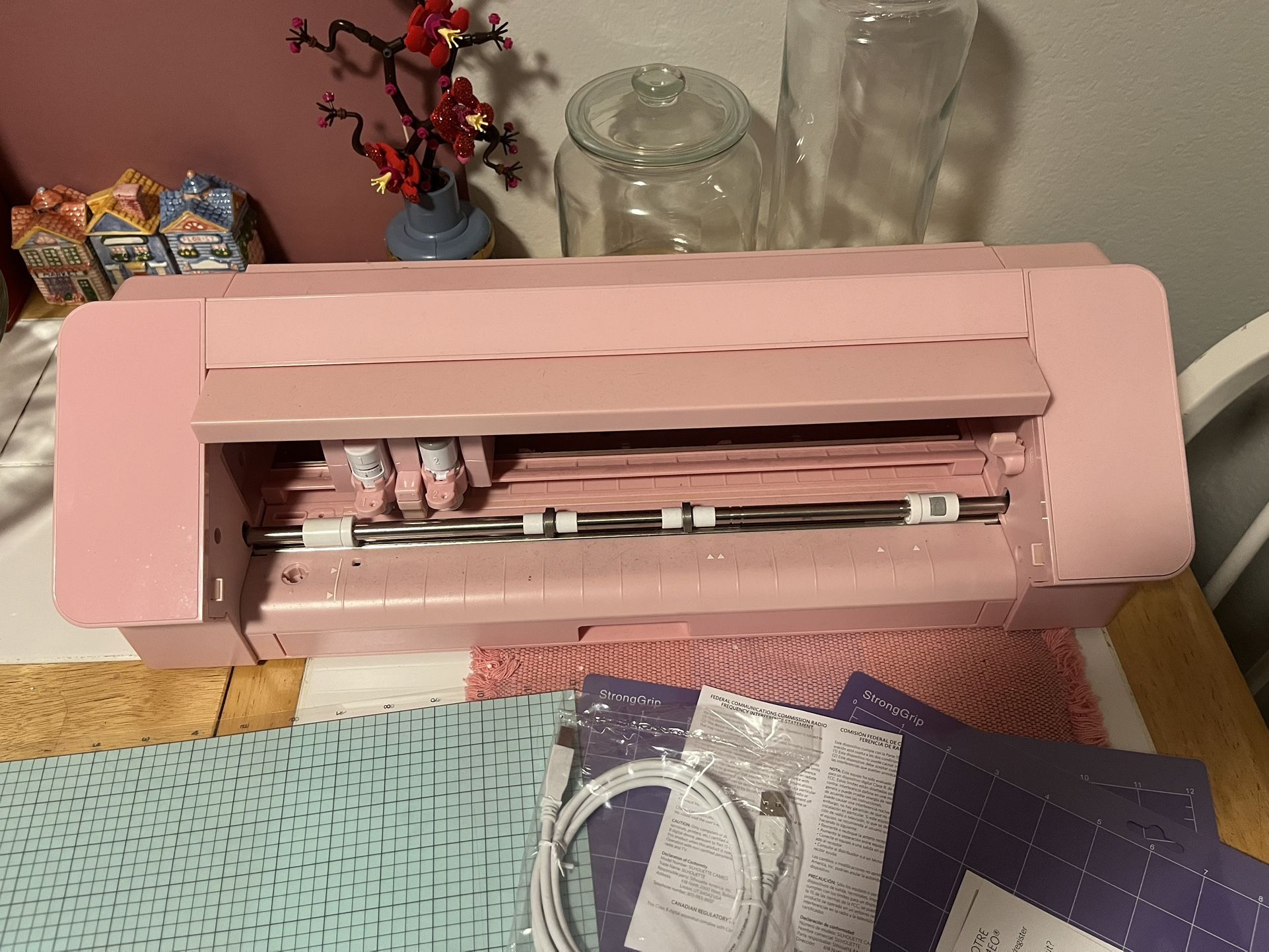 Silhouette CAMEO only used once. Comes with sticky mats pictured here, four attachments, power wire, and paperwork.