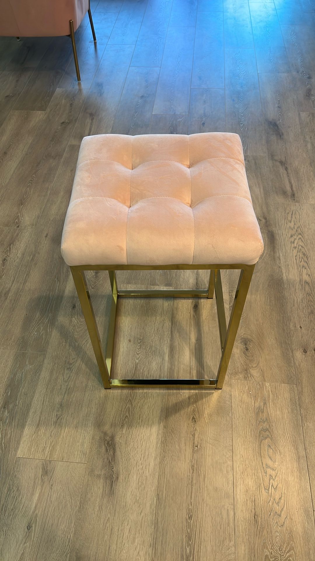 6 beautiful counter stools. They have gold legs and a pink cushion. All 6 stools are undamaged.