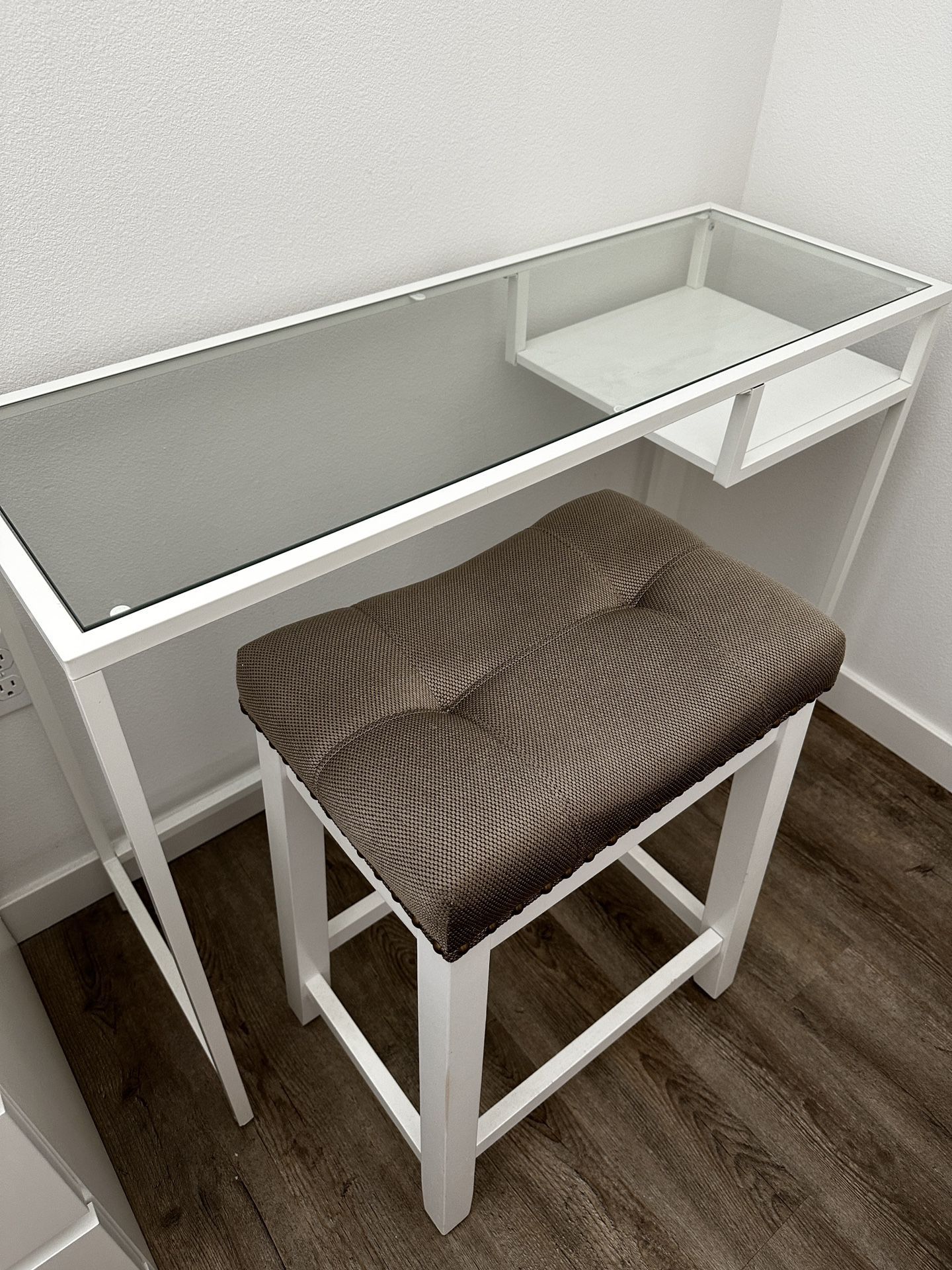 Moving Sale! Best Offer Glass Top Metal Vanity Table 30”Hx39.5”Lx14”W New condition White Metal Legs Glass Desk