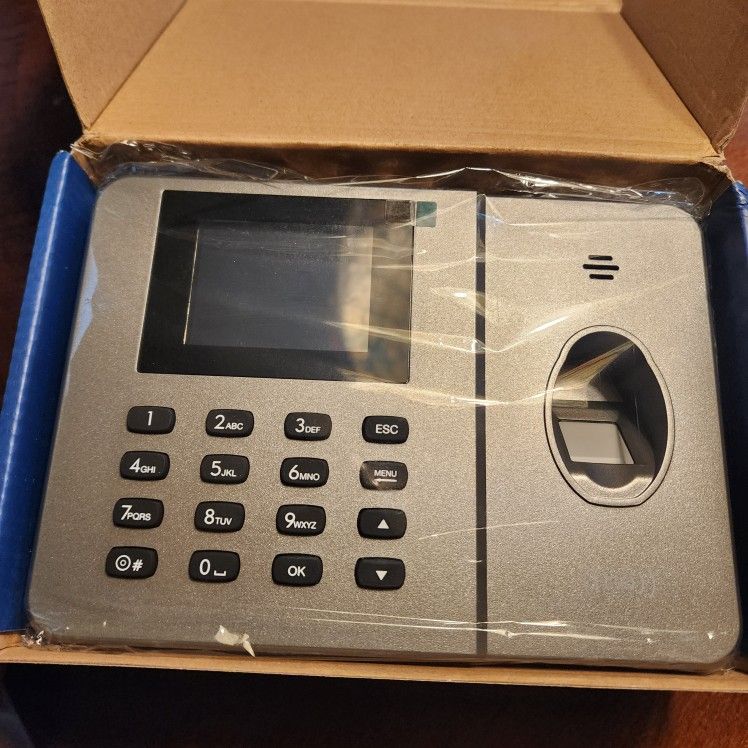 Fingerprint,code or card time attendance device. Comes with 10 cards. Open box . Goes for $160 online