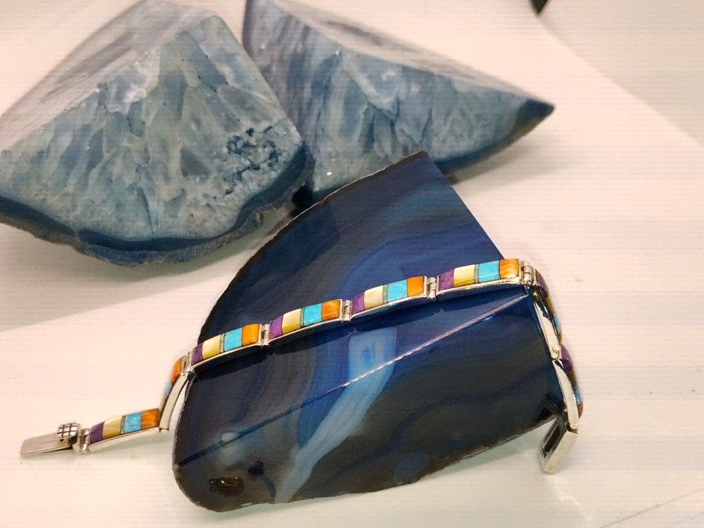 Will deliver local or pickup in applewood. This thing is gorgeous! Mint condition . Reg 400.00 on other apps and websites. 7.5" in length, 1/2" wide Flawless sterling and natural gemstone inlay, Stones have a wet newer " contemporary look " to them multiple gemstones, including turquoise, jasper, 925 silver bracelet Done by raftsman (Navajo Native Artist )signed by "Philippines"