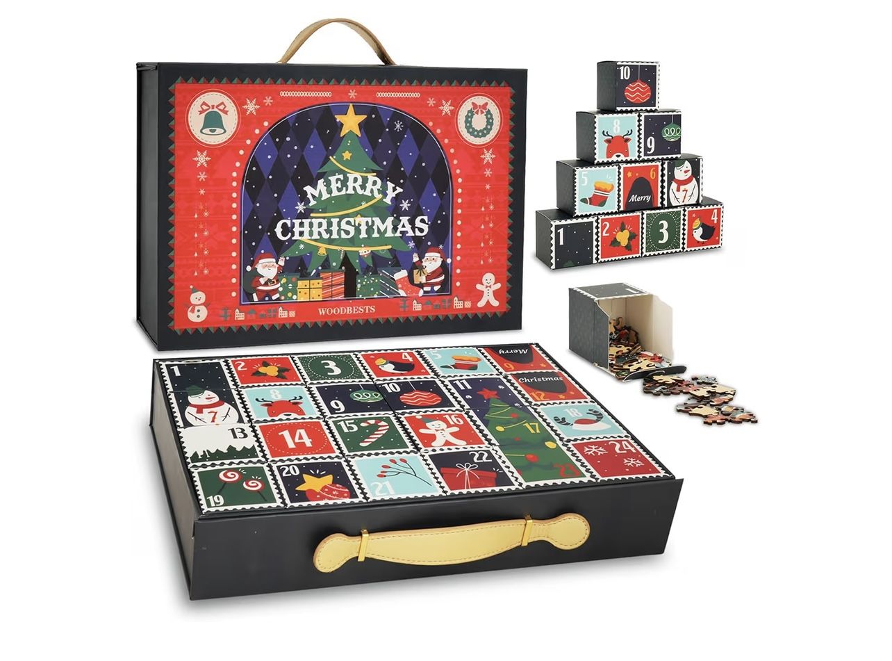 24-Day Puzzle Advent Calendar - Unwrap 24 days of festive wonder with our premium Christmas countdown puzzle calendar. Beautifully presented in a high-quality gift box, this Christmas set includes 1200 pieces wood puzzles divided into 24 compartments, each revealing a unique-shaped 5.5" x 5.5" wooden Christmas puzzle for daily surprises from December 1st to 24th. Daily Festive Surprises - Unlock the surprise journey on your magical Christmas map day by day. Each day, open a new blind box to discover a charming Christmas-themed puzzle. Share the anticipation with your kids as you piece together a new story every day—creating cherished moments all season long. Creative Christmas Gift - Presented in an exquisite gift box (15" x 10.3" x 2.8"), this wooden puzzles set makes an unforgettable gift for family, friends, DIY lovers or yourself. After completing each puzzle, display it as festive wall art Retails $88