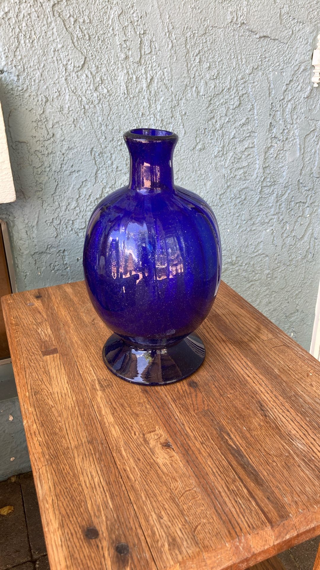 This was made by a glass blowing artist. Deep blue, beautiful shape. Very unusual vase.