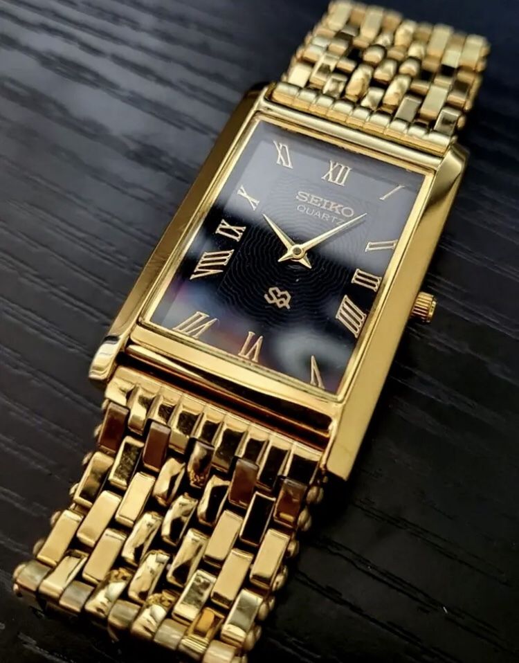 Dial Pattern Roman Indices Roman Numerals Year Manufactured 1(contact info removed) Band/Strap Two-Piece Strap Case Color Gold Handedness Left Department Men Caseback Snap Lug Width 20 mm Watch Shape Rectangle Style Casual, Dress/Formal Features 12-Hour Dial Case Size 26 mm Case Material Gold Plated Movement Quartz Water Resistance Not Water ResistantDue to the nature of used and vintage