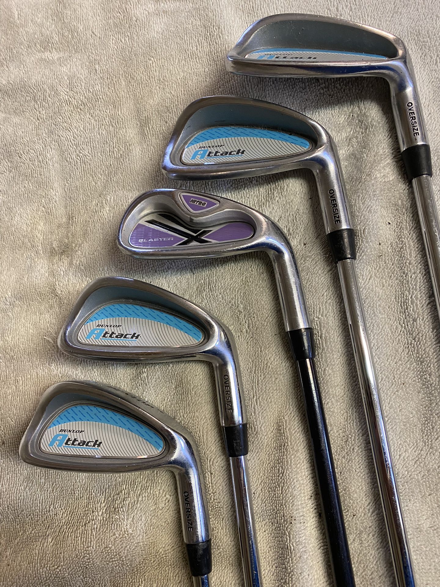 Nice set of ladies clubs in excellent to almost new condition. Irons are Dunlop Attack #5, 6, 7, 9 plus the PW. Shafts are reg stainless with good grips. There’s a #3 and #4 hybrid with graphite shafts and good grips. Set also has a Lady Edge #3 and #5 fairway wood along with a 10.5 driver graphite shafts. Also a Dunlop putter and nice bag with stand and harness