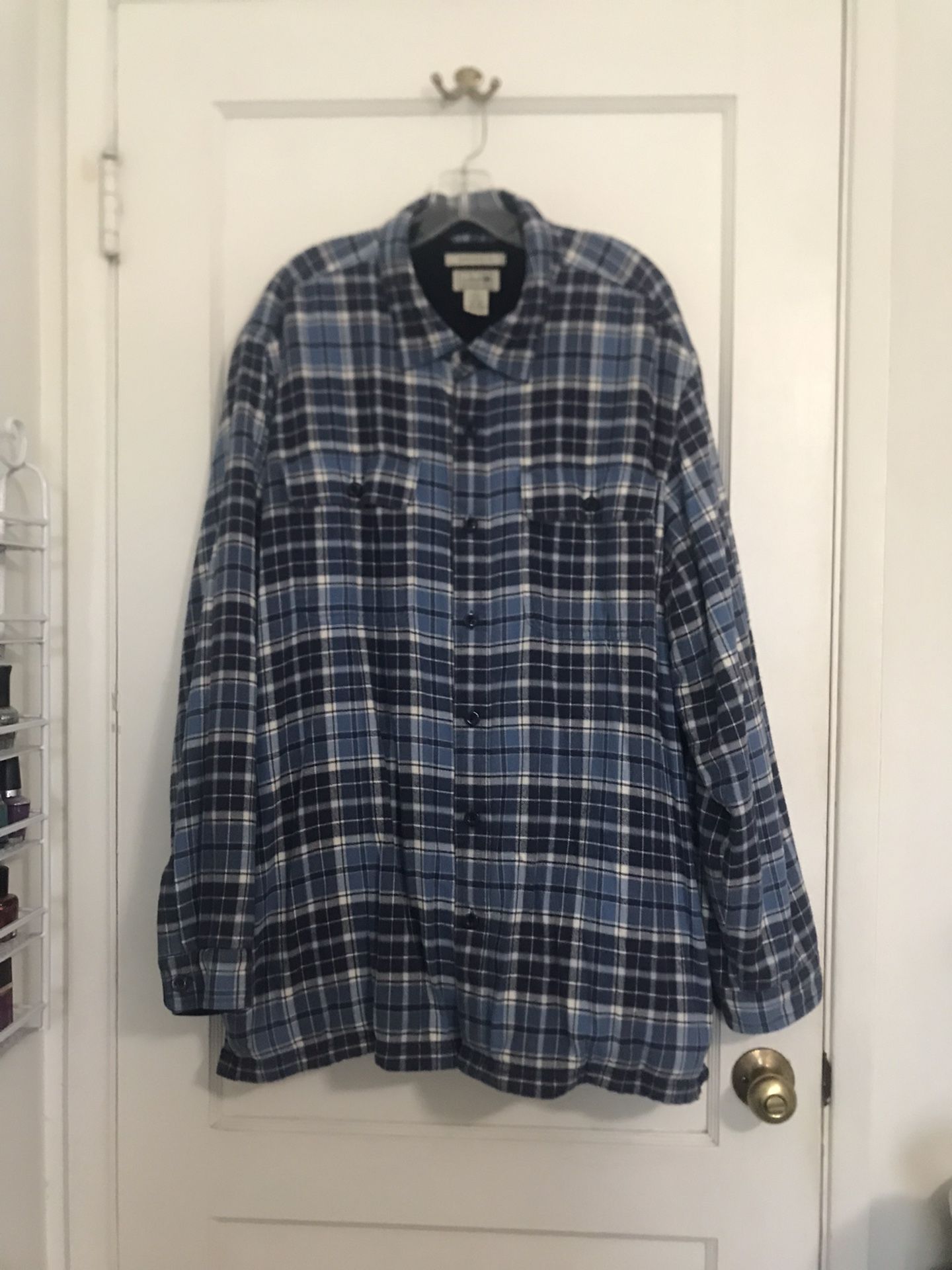 Classic blue plaid flannel shirt in a relaxed fit 👕Soft, breathable fabric for all-day comfort 🍺Button-front styling with chest, side and inside pockets for easy storage 🏈 Versatile blue plaid pairs well with jeans 👖 (bin 17)