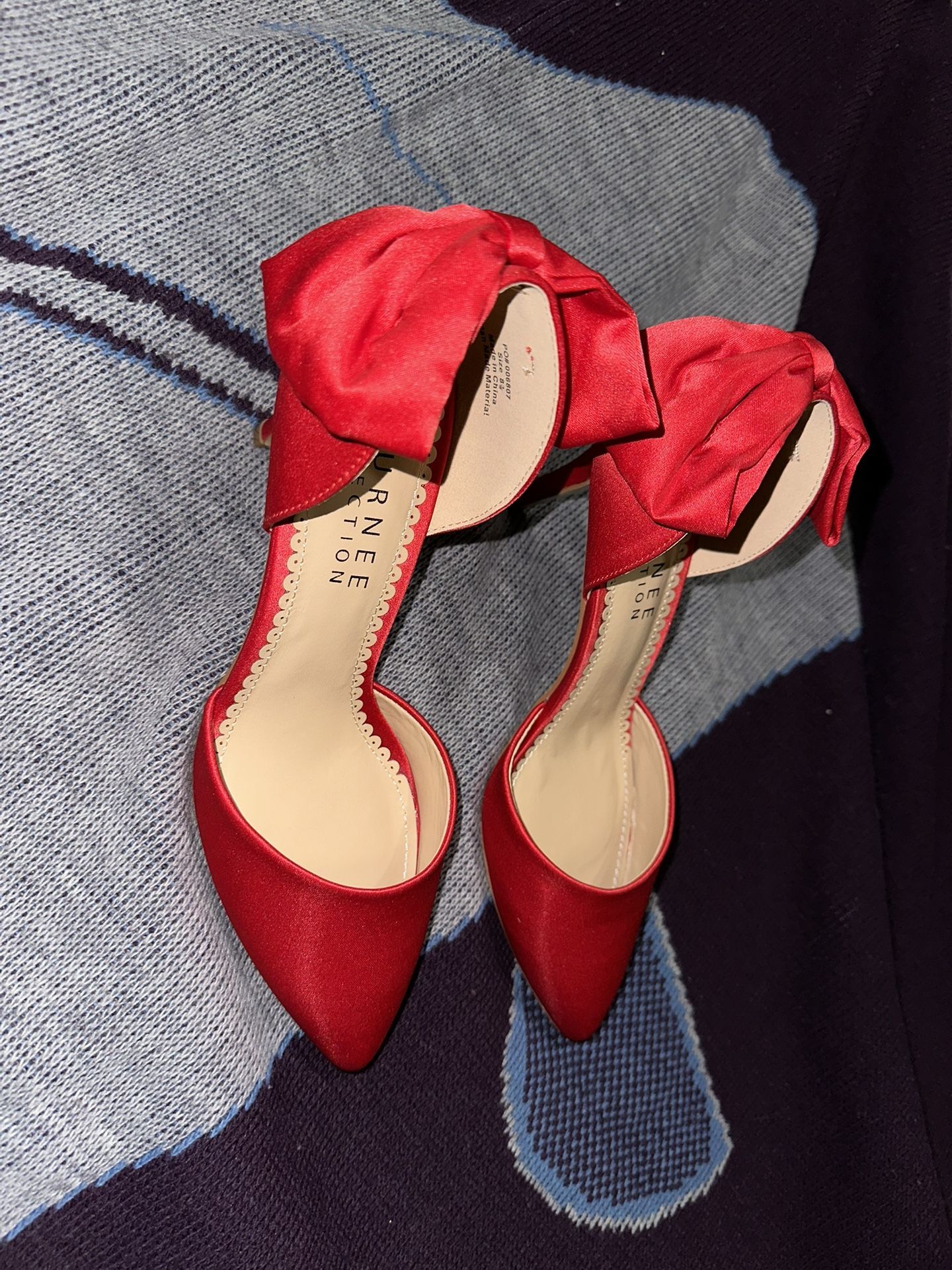 Brand new! Women’s beautiful lipstick red Satin pumps with a big red bow on the heel. Size 8.5. They run a little big. Brand Journee collection.