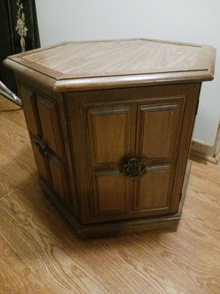 Hexagon shaped nightstand / coffee table. 20 inches tall & 2 feet wide on all sides. Big cabinet space on the inside. Both doors close and latch.