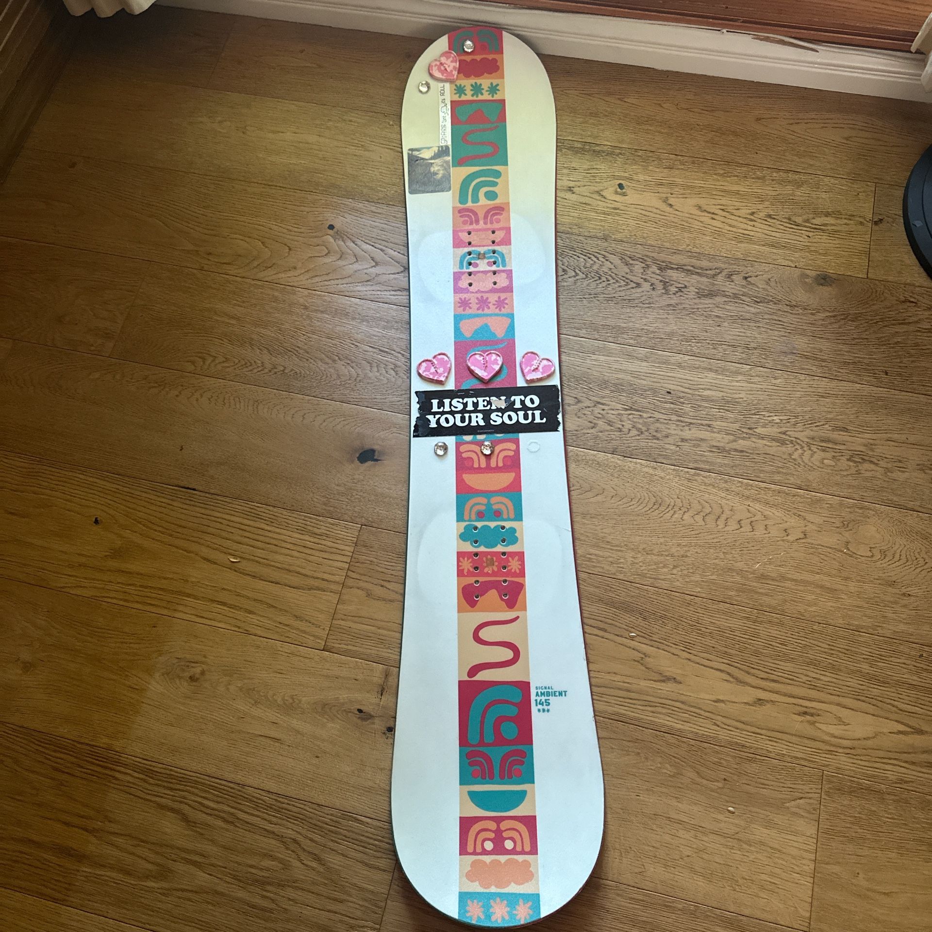 Signal Ambient Snowboard size 146 cm women’s park board, mid flex/stiffness such a cute board, and performs great in the park or on groomers The rust on the back will come off with board cleaner, it’s just from hitting dirty rails #snowboard #snowboarding #womenssnowboard #wintersports #cute