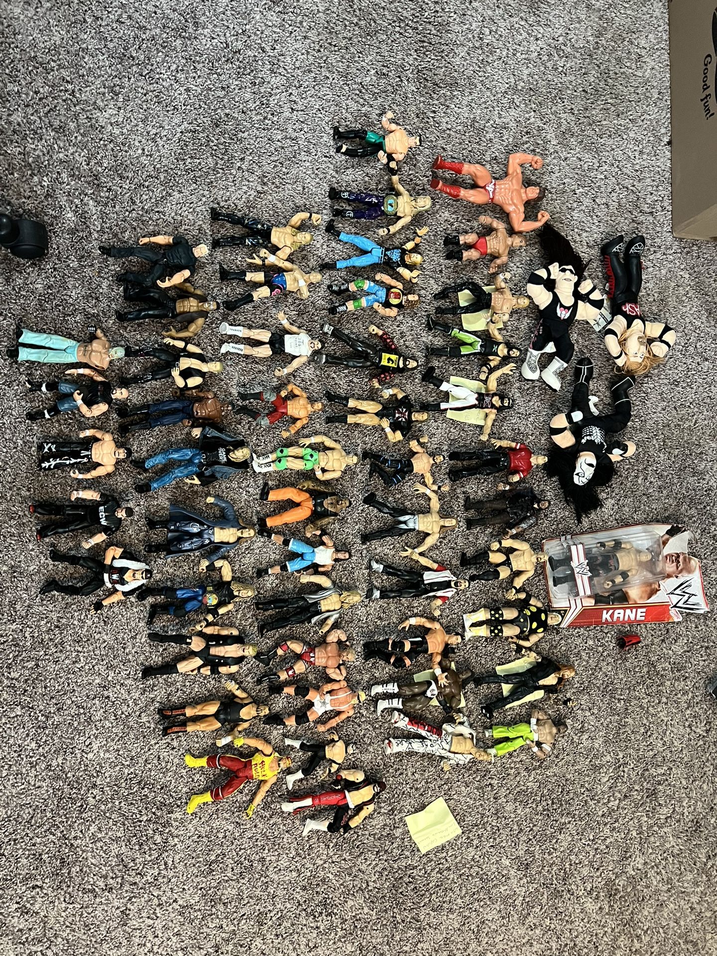 I’m listing less than $4 per wrestler, but will entertain offers, low ball bids not accepted. Only 1 wrestler missing arm, Rey Mysterio the rest good condition. Some are also action activated, pull arms down Best offer close to my price listed win, or make offer I can’t refuse. 54 wrestling figures total, 1 is mini figure 1 in box, 3 are stuffed soft figures.