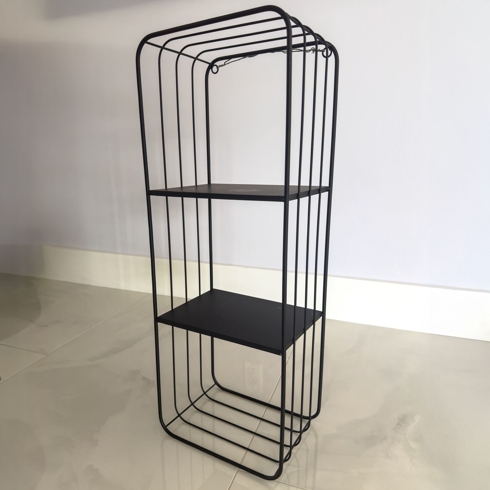 Sleek, modern black metal decorative shelf with an open cage-like frame and two sturdy display surfaces. Great for books, candles, plants (faux), or accent pieces. Minimalist design works perfectly in modern, industrial, or urban interiors. Lightweight and easy to move. Excellent used condition with no visible flaws. Stylish upgrade for home, office, or studio.