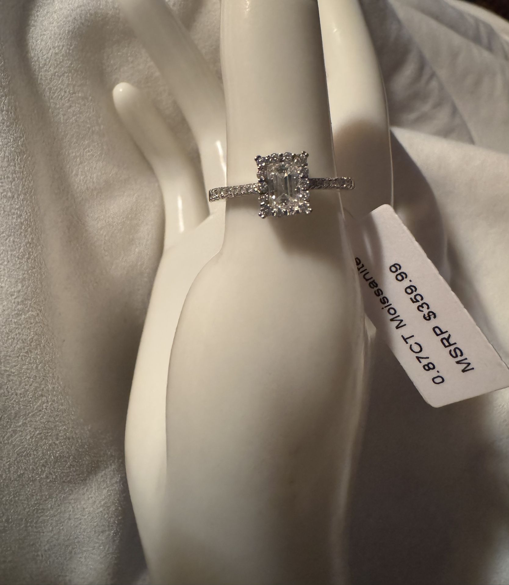 NEW 0.87CT Sterling Emerald Cut Moissanite Halo Ring, Size 7