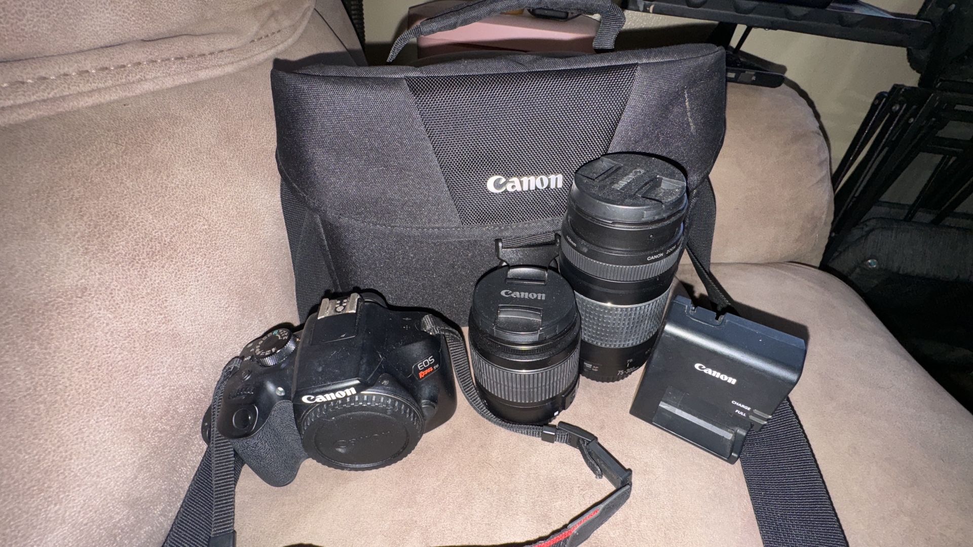 Comes with: -Camera with a strap -18-55mm lens -Charger -extra 75-300 lens -Case with strap -SD card (Only used for one semester of college)
