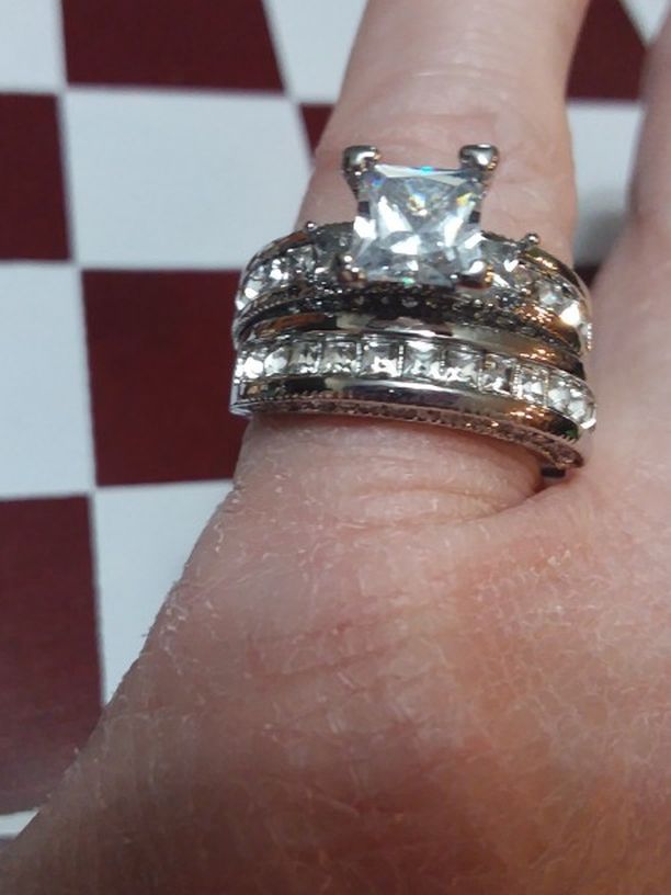 925 Sterling Silver with White Crystals Princess Cut ENGAGEMENT RING and WEDDING BAND SET. Size 7. $30.