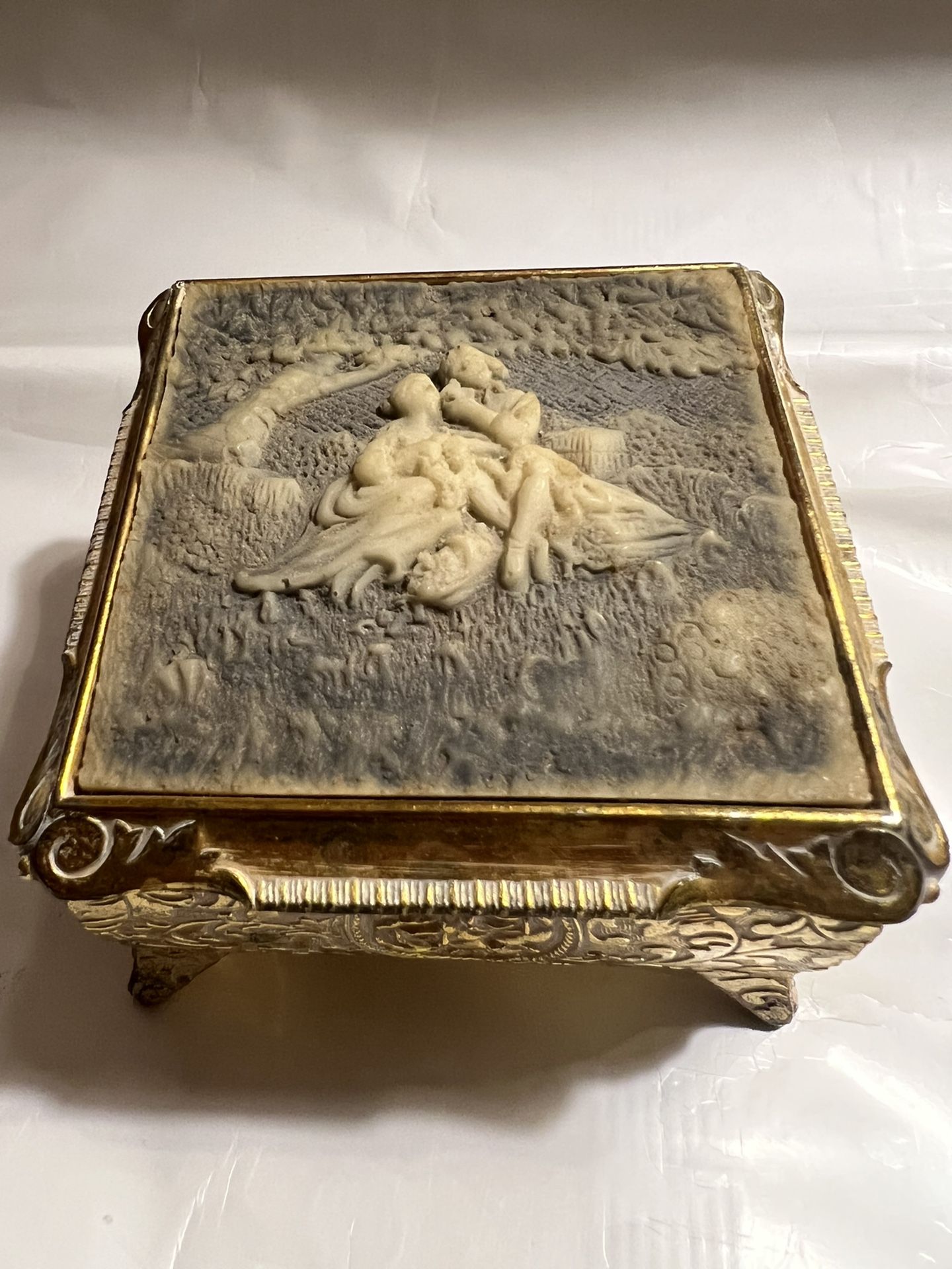 Vintage Gold & White Cast Lidded Trinket Box with Music Box Player, Raised Courting Scent on Lid Made in Japan. Size appox 3 1/2 x 3 x 2 1/4