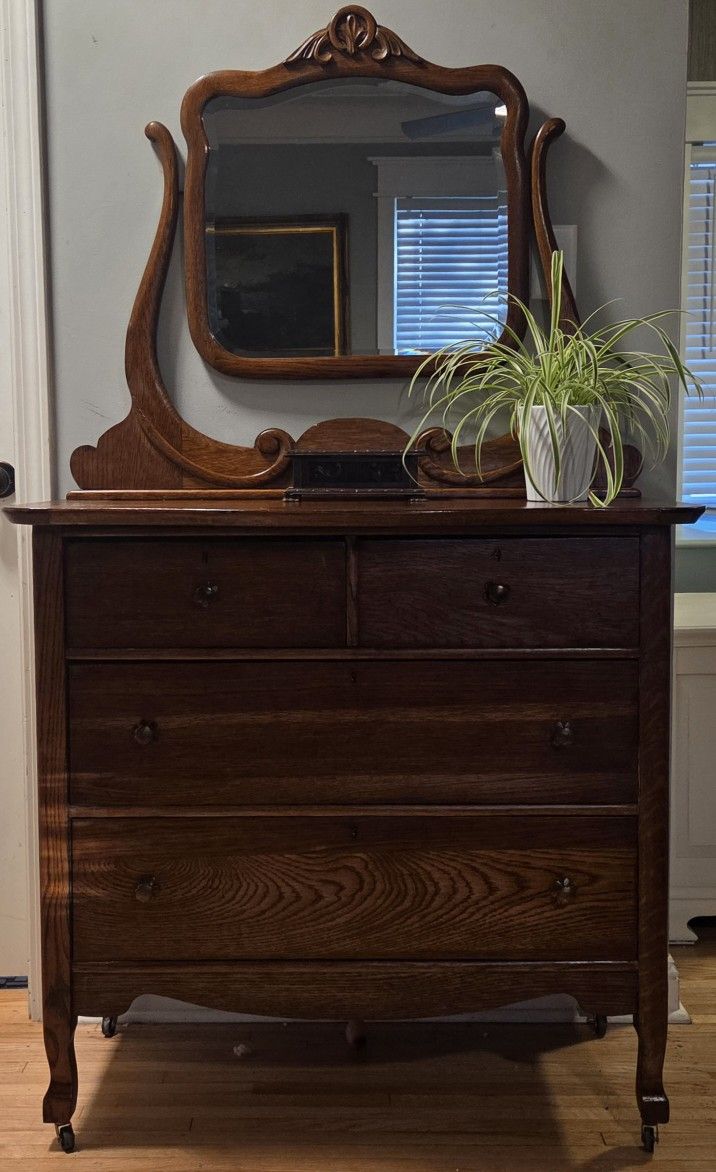 Depression era Original hardware Dove tail drawers Swing mirror 4 drawers Never refinished Some imperfections/repair to top (see pics) 66T x 38L x 21D