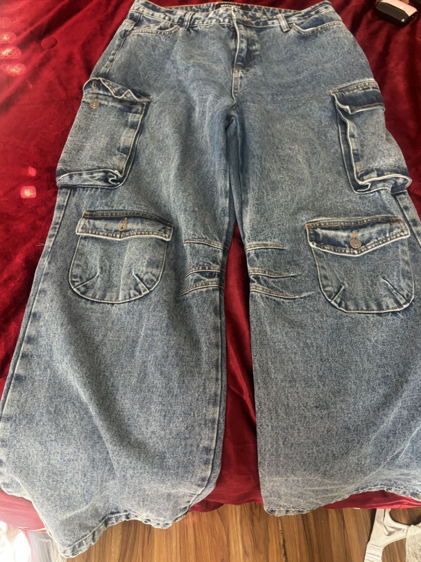 Retro Y2K‑style baggy cargo jeans with multiple large utility pockets and vintage wash. Unisex relaxed fit, perfect for a streetwear or 90s look