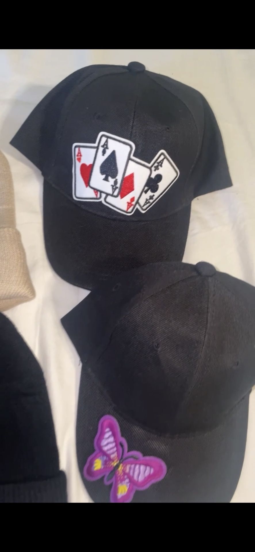 hats with embroidery patches on them, i made them myself so theyve never been worn. all are $15 each, message me with the one(s) you’re interested in buying and we can go from there.