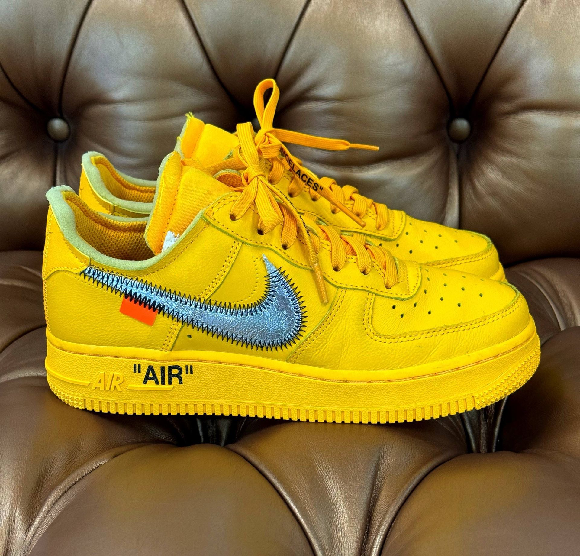 Size 5 Nike Air Force 1 Low OFF-WHITE in the striking University Gold and Metallic Silver colorway. Designed in collaboration with Virgil Abloh, this limited-edition sneaker features premium leather construction, signature OFF-WHITE details like the exposed foam tongue, industrial-style text on the medial side, and a bold metallic silver Swoosh with visible stitching. Completed with a classic Air sole unit for comfort and the iconic zip tie tag, this pair is a must-have for collectors and streetwear enthusiasts alike Used condition, has some heel drag, very very small star loss. No box, no extra laces. CONDITION AS PICTURED