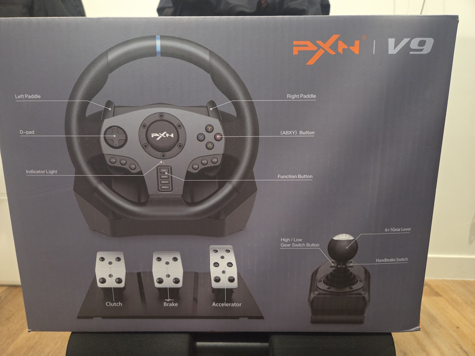 Gaming steering wheel, with 3 pedels, and shifter, works well, opened box PXN V9