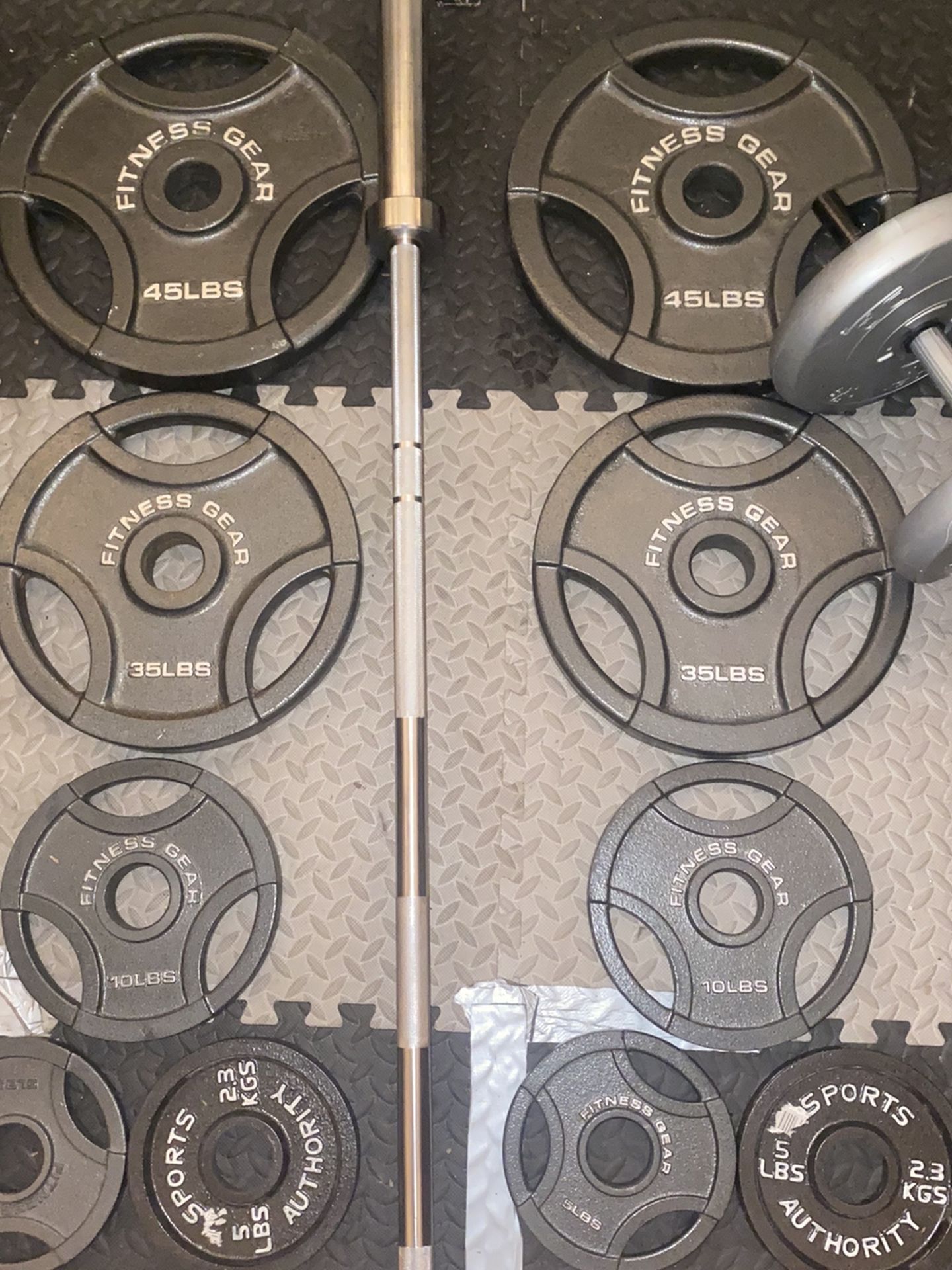 45s 35s 10s 4-5s Barbell 28 pound dumbbell