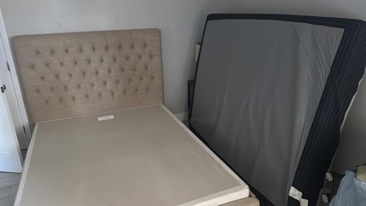 Free matress and box spring. Queen size. Box frame is heavy. Bed frame not available!