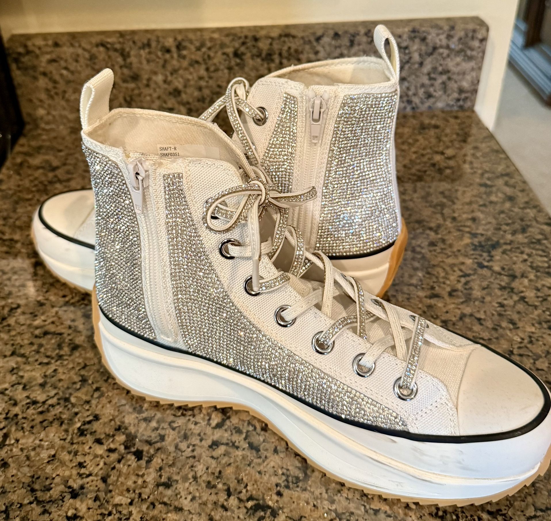 Brand new, glittery silver Steve Madden tennis shoes. Asking for $100, but will hear offers. They are a woman’s size 9