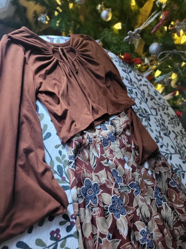 Two piece set: Koret Vintage Skirt, calf length, brown floral print, sinched adjustable waist with button size 8. Very flattering. Earthbound bellsleeve crop top, Brown, with keyhole detailing. Extremely soft.