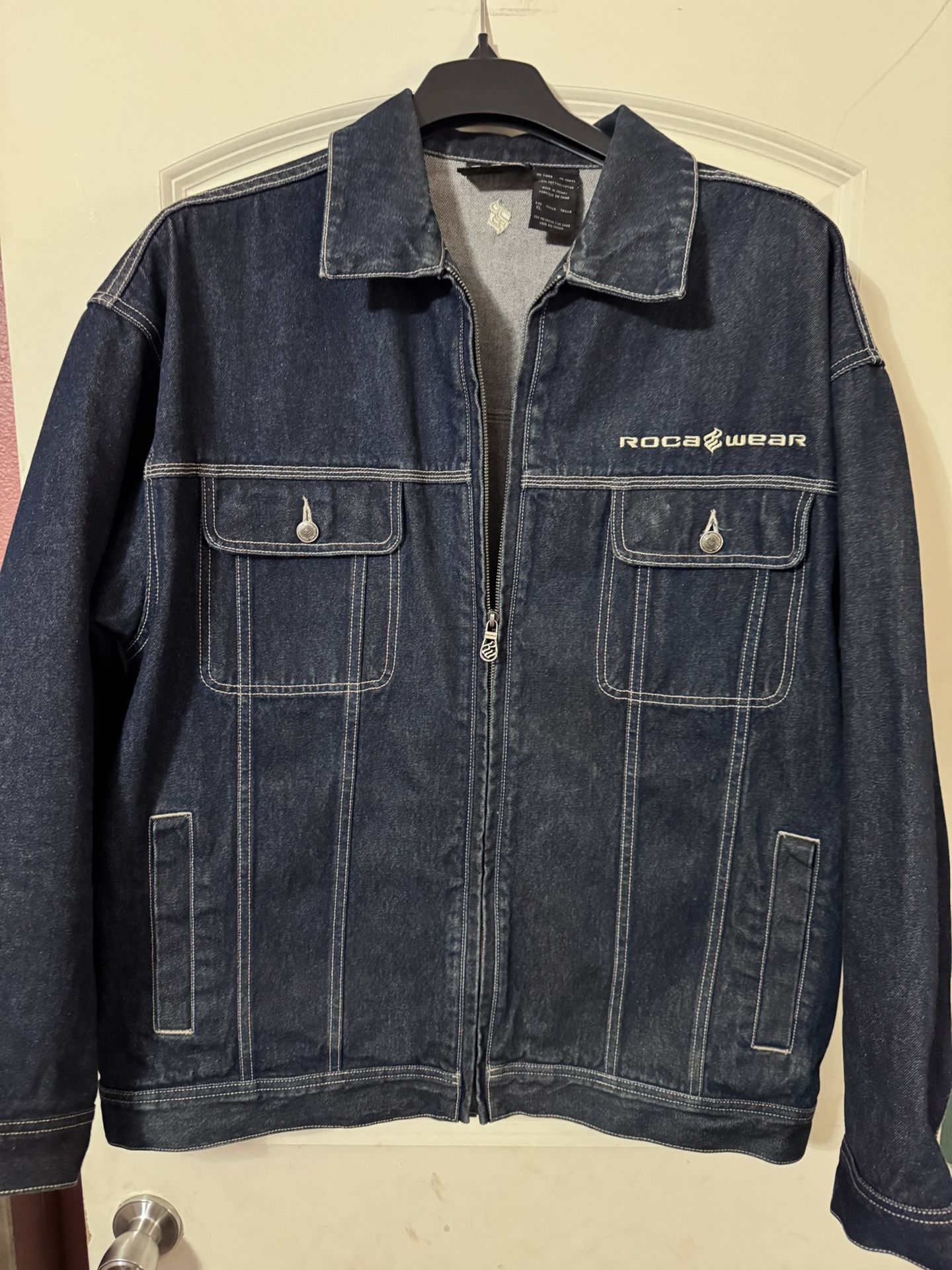 Selling a vintage hip hop y2k 90’s rocawear denim men jacket in excellent conditions almost like new full zip Size XL baggy/oversized fit $75
