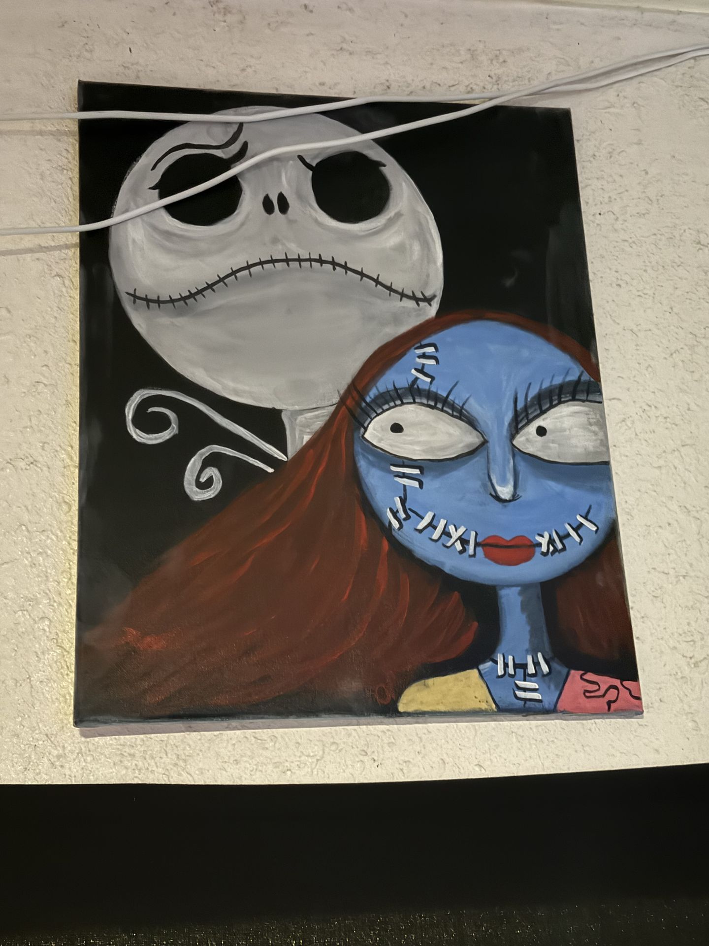 Handmade jack and sally painting, from nightmare before Christmas. Medium size canvas, from hobby lobby. SERIOUS INQUIRIES ONLY. Price may be negotiable.