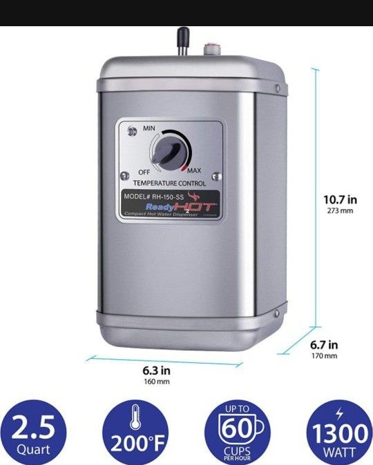 Looks good. Good Condition.INSTANT HOT WATER DISPENSER: The Ready Hot compact instant hot water dispenser can dispense 60plus cups of near boiling water per hour with a manual adjustable temperature range from 140F to 200F. Tank only (faucets sold separately)MANUAL TEMPERATURE CONTROL: Manual temperature control knob allows you to adjust your desired temperature on the hot water machine between 140°F and 200°FCOMPACT STAINLESS STEEL DESIGN: Designed for under sink installation, the compact design of the 2.5-quart stainless steel dispenser tank offers space-saving convenience with a 120-volt 1300-watt stainless steel heating element for efficient heatingHOT WATER ON DEMAND: Ideal for home, office, restaurants, cafeterias, or wherever instant hot water is needed. Make instant hot tea, coffee, soup, oatmeal or cook noodles al dente. Also great for loosening stubborn jar lids and warming baby bottlesREVERSE OSMOSIS COMPATIBLE: The non-copper waterways of this tank make it ideally suited for reverse osmosis applications to ensure the highest quality of water available very low in total dissolved solids (TDS) for residential applications
