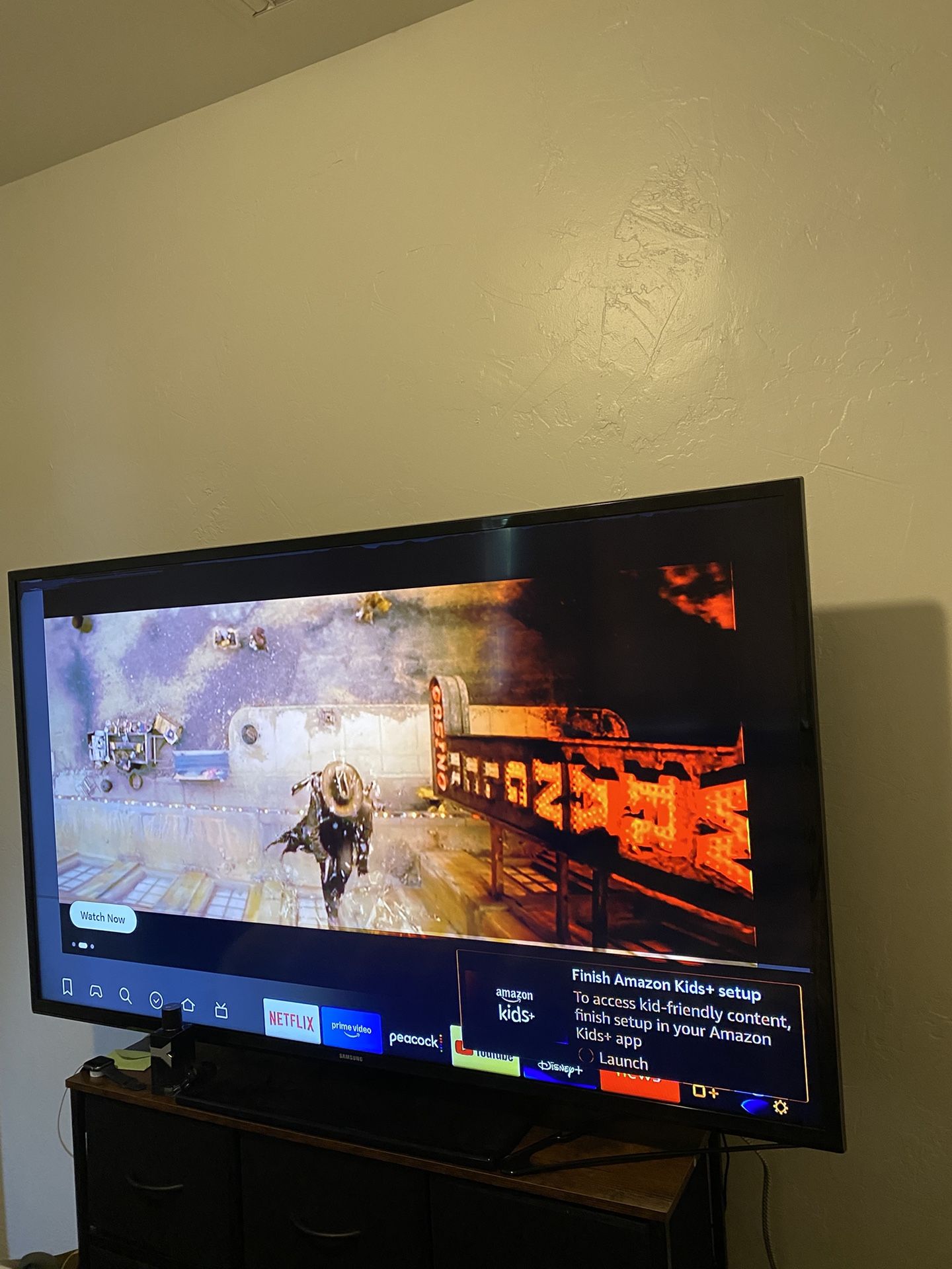 Around 84”x 60in Has slight force damage on the right hand side which causes some discoloration, but we’ve been able to use it with Firestick for a while. Remote included (batteries inside).