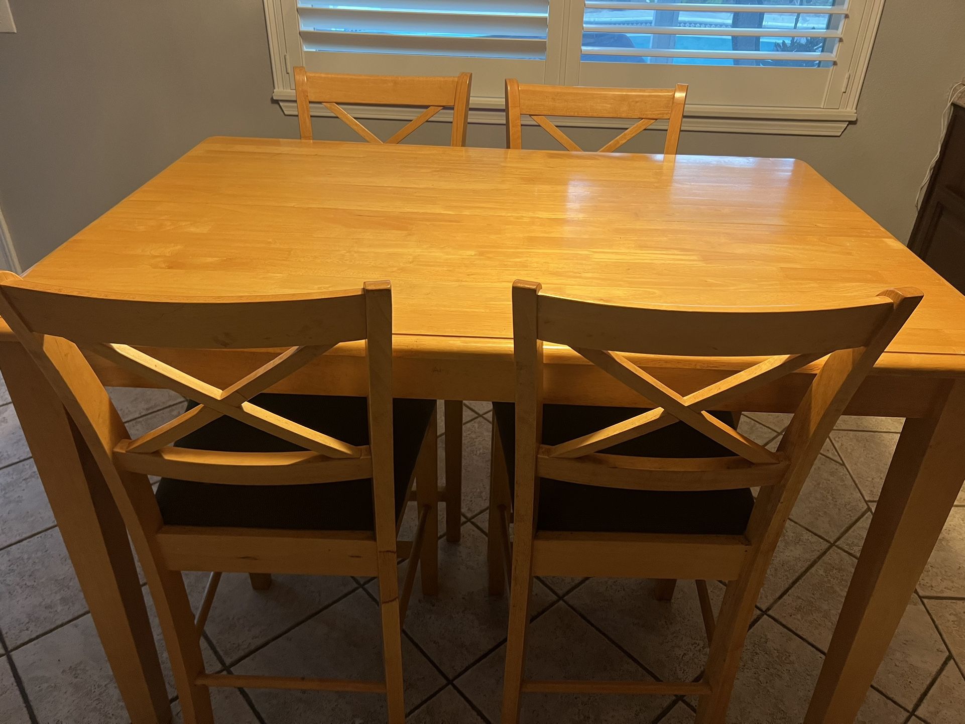 High dining table w/6 chairs for sale. Measures 54”x36”x 36”. Does expand to 54”x54”. $65 or obo