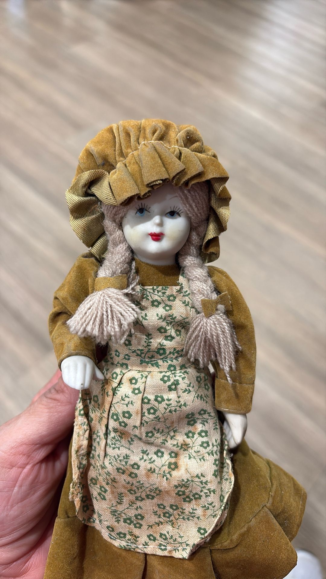 Beautiful antique doll. No chips or cracks all original. Normal faded fabric . Velvet green dress.