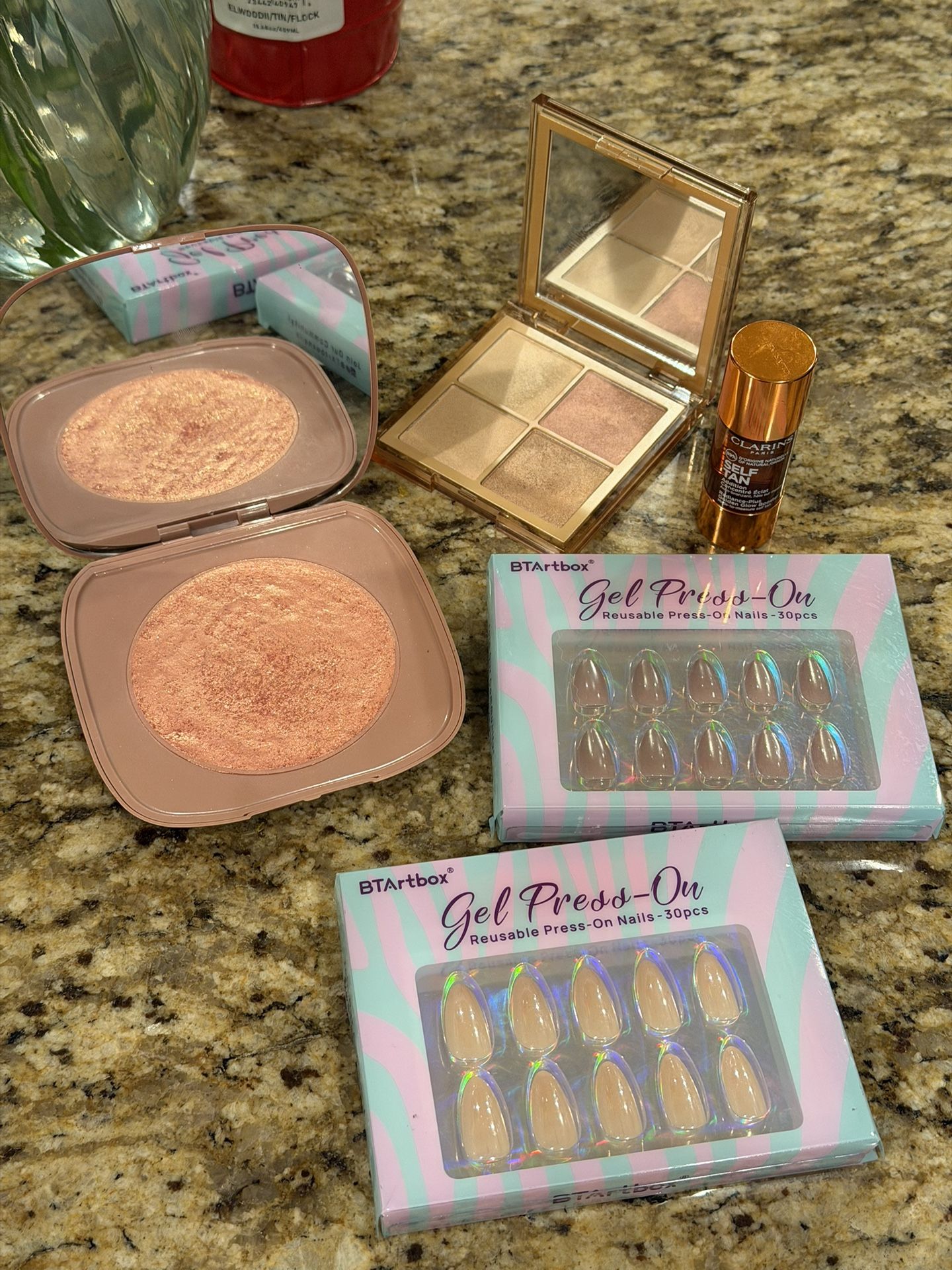 Huda Beauty Light Glow Obsessions Palette, 2 Sets Of Reusable Press On Nails (30 Pcs), Clarins Self Tanner, And Colourpop Highlighter!