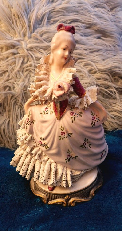 These German-made figurines are known for their intricate, delicate skirts made from real fabric dipped in porcelain slip before firing in a kiln, which burns away the fabric leaving a rigid, fragile lace shell. Style: The figurine is in a Victorian or Rococo style, a common theme for Dresden figures, depicting an elegantly dressed woman Material: It is made of hand-painted glazed porcelain with real lace overlay.
