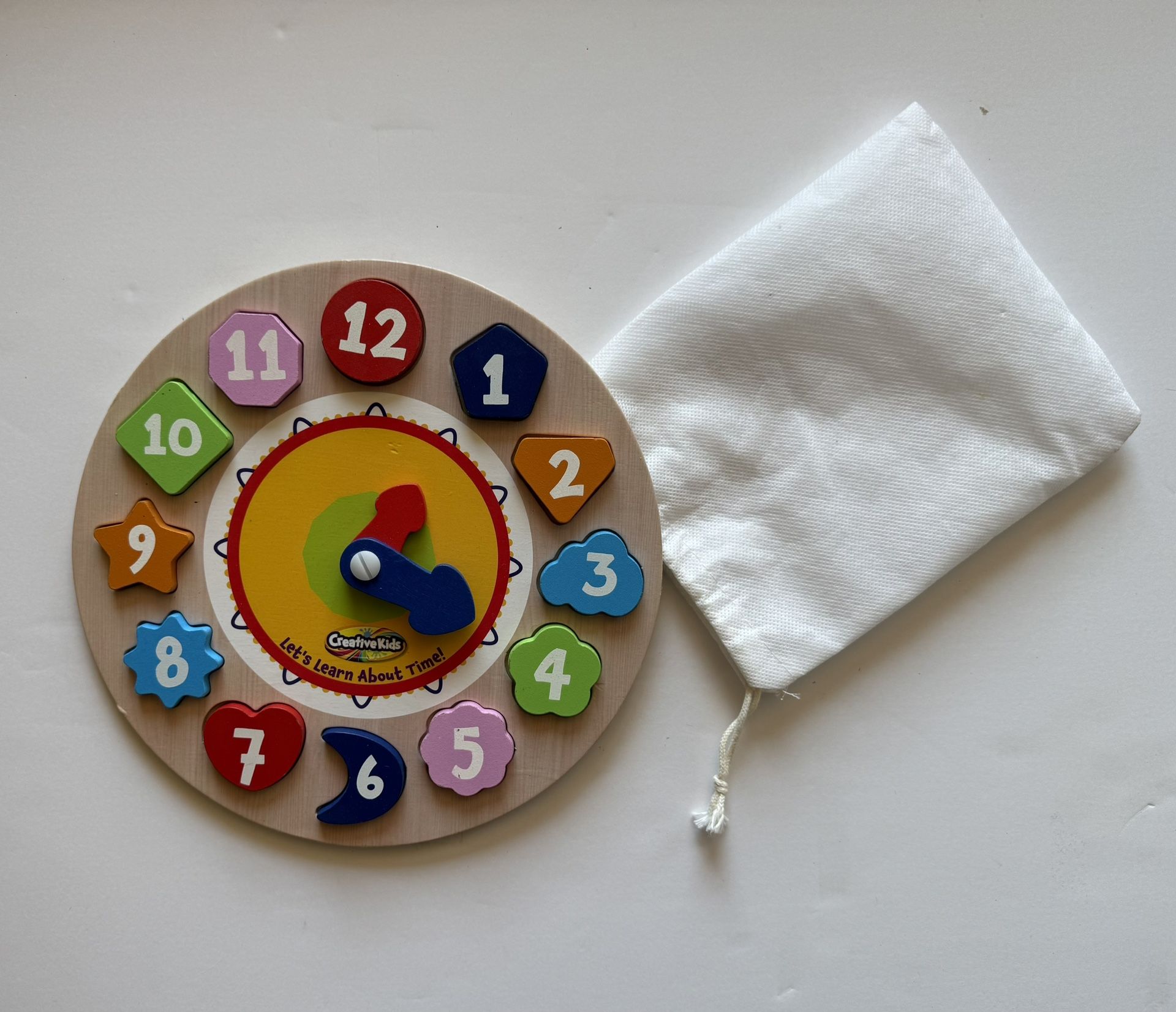 Learn numbers and shapes with this cute clock face puzzle. Comes with storage bag.