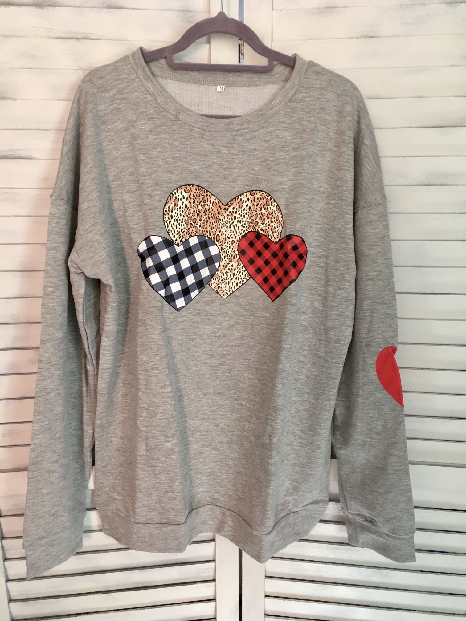 Women’s 3 Hearts Print Sweatshirt, Gray. Size Medium. Measurements: Chest 42”, Length 27”. Cotton Blend. NWT. #heartsweatshirt #sweatshirt #graysweatshirt #womenssweatshirt #hearts