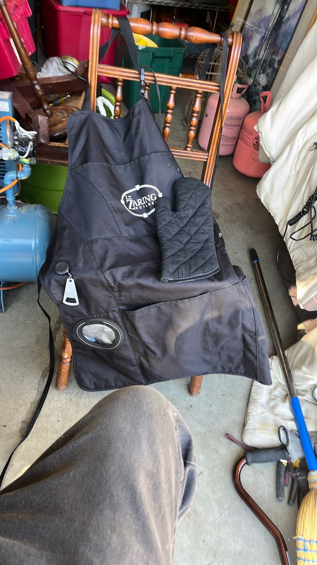 The image shows a black grilling apron with a matching oven mitt. The apron has a logo that appears to say "LT ZARING BUILDER."