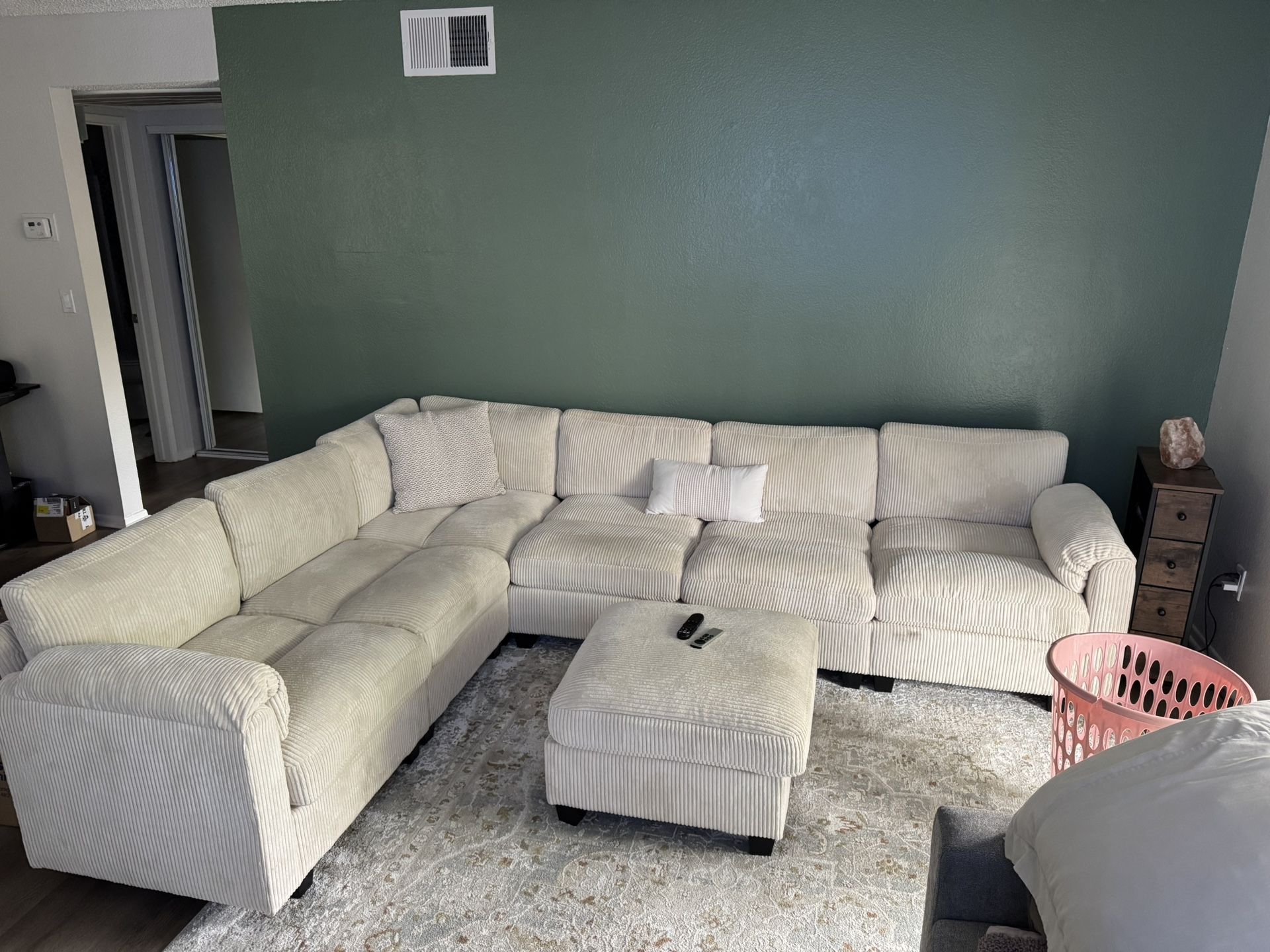Large Beige Corduroy Sectional Couch with Ottoman - $500 (OBO) Selling a super comfortable and stylish L-shaped sectional sofa with matching ottoman. • Includes matching ottoman • Neutral beige corduroy fabric • Deep, comfortable seats • Gently used and in good condition (see photos) • Comes from a clean, smoke-free home, Pet Free home. Minor signs of normal use but no rips or major stains. Everything is in great shape. Perfect for a living room upgrade, apartment, or family space! 💵 Asking $500 OBO — serious offers only please. Pickup only.